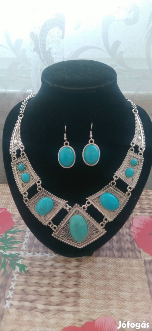 Kihasználatlanság miatt eladó türkiz ásvány kövekkel és virág mintás motívumokkal díszített ékszer szett.
