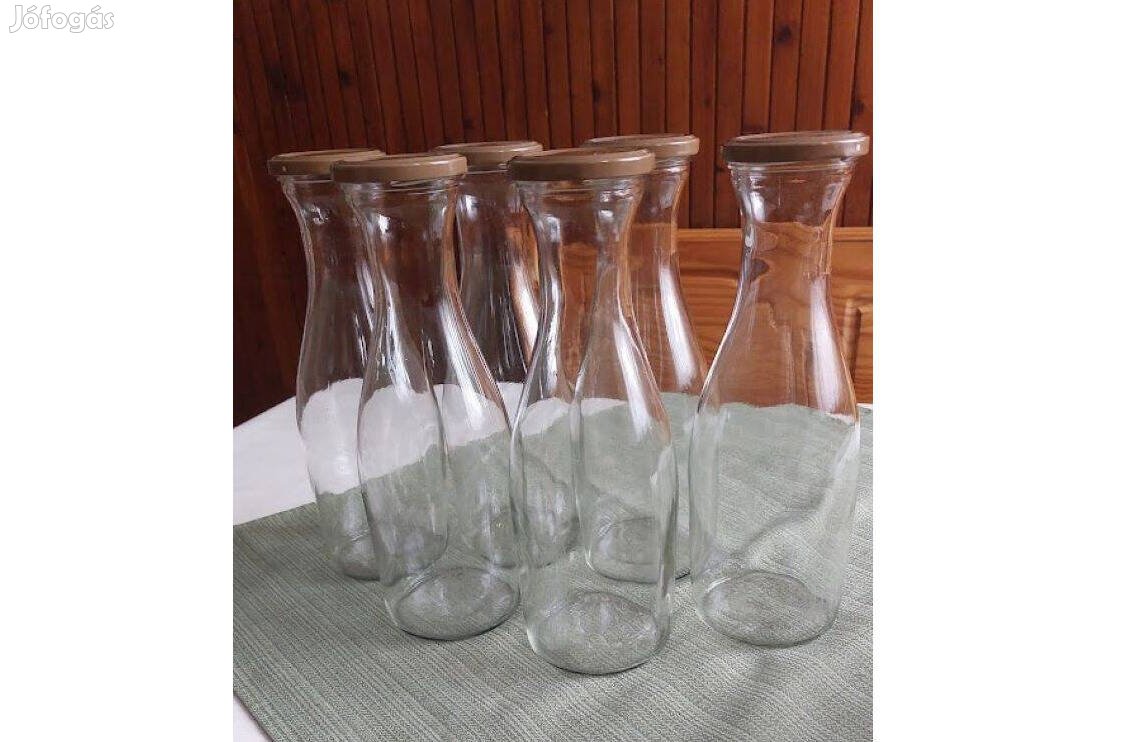 Szép formájú, ital tárolásra, hagyományos befőzésre, szörp készítésére, kreatív célokra is alkalmas, biztonságosan záródó csavaros tetejű vastag, 1 liter űrtartalmú üveg. Magassága 36 cm, talp átmérője 9 cm, csavaros tető átmérője 7 cm. Összesen 40 db van belőle (100 Ft/db)