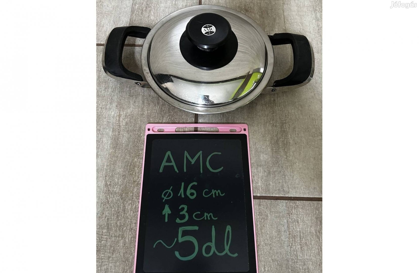 Eladó egy használt AMC 16 cm belső átmérőjű, 3 cm maga, kb. fél literes rozsdamentes edény fedővel. A fogantyúiból alul mindkét oldalon hiányzik egy-egy pici darab (fotóztam), használata természetesen nem befolyásolja.