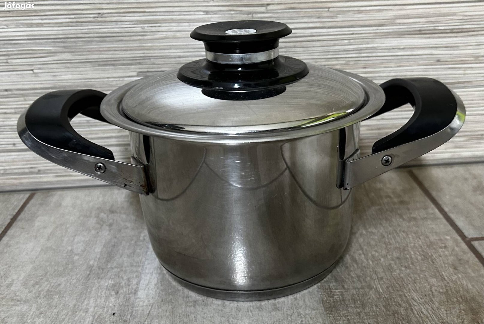 Eladó egy használt AMC 16 cm belső átmérőjű 1,6 literes rozsdamentes edény fedővel.