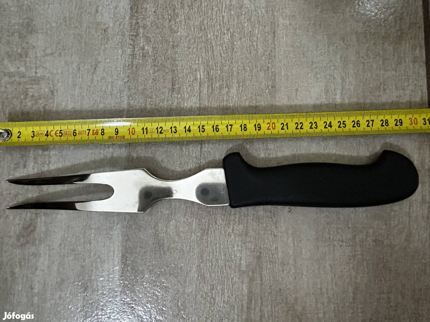 Eladó egy használt, de újszerű állapotban levő AMC rozsdamentes-műanyag húsvilla. Mosogatógépben mosható.