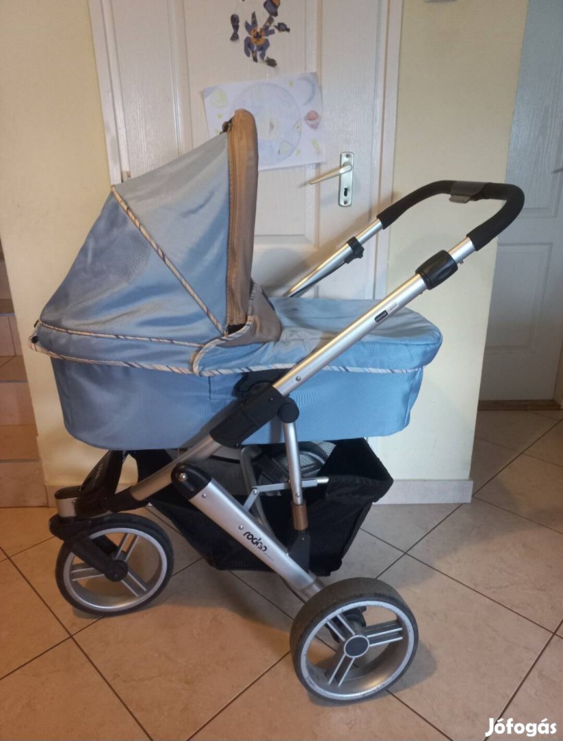 Mózes és sport részből allo babakocsi ,három nagy tömör kerékkel ,igazi terepjáró,túrázáshoz kivalóan alkalmas .Sport része mind a két írányból feltehető.