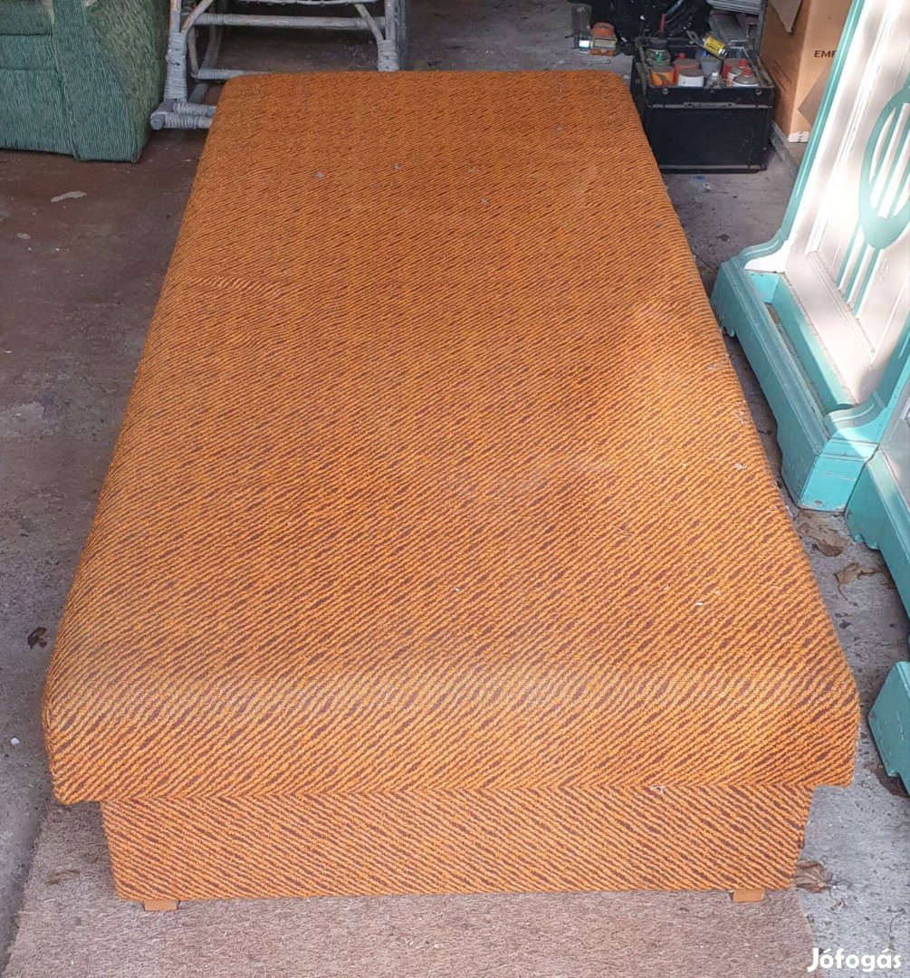 ?Ágyneműtartós heverő eladó narancssárga texturált kárpitozással es felnyitható fekvő felülettel.
