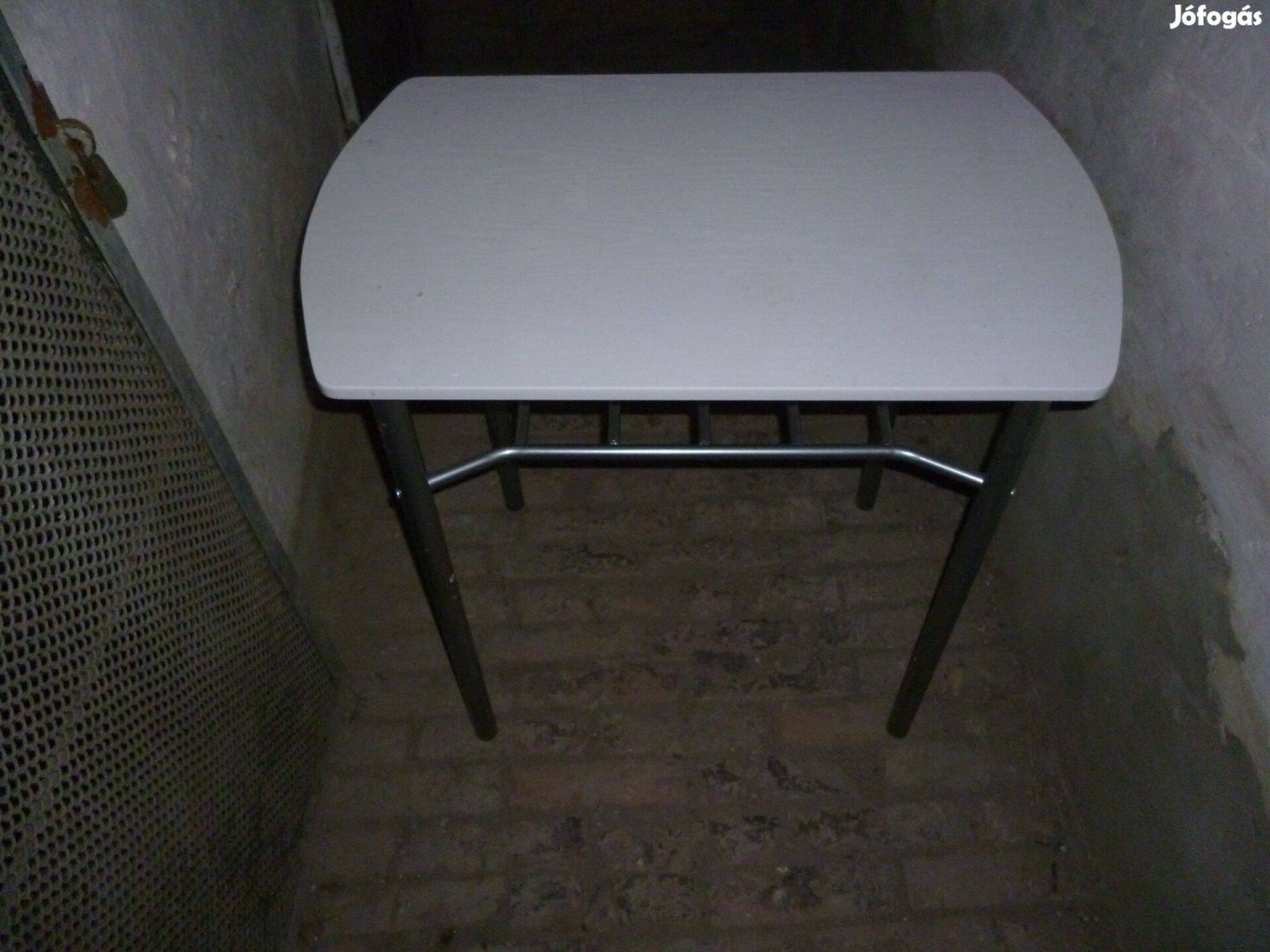 Asztallap fából van, a keret fémből. Mérete: 50x80cm, magassága 76cm.