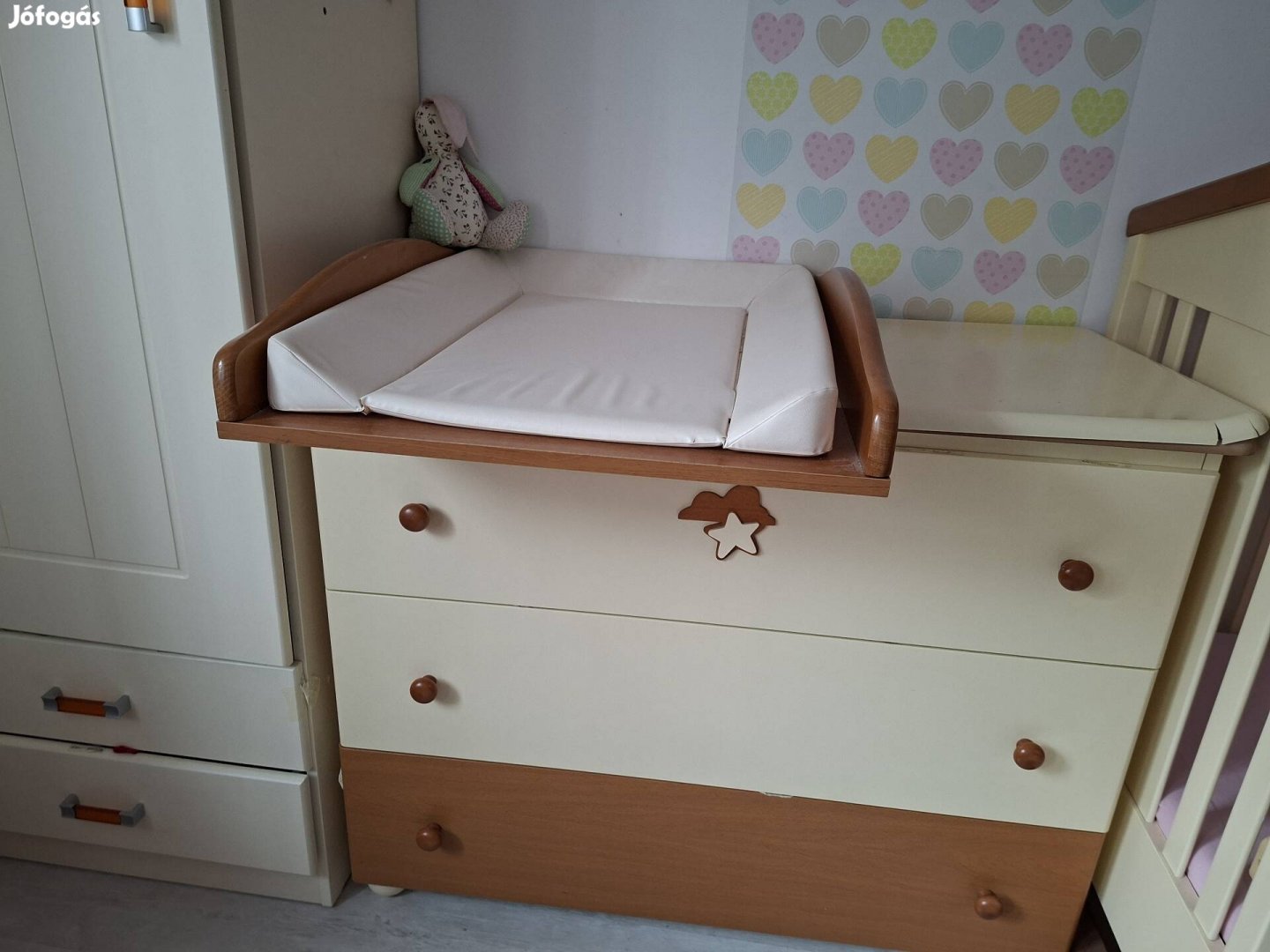 3 évet használt. Székesfehérváron megnézhető. Komód tetején lévő burkolat feljött. Amúgy szép állapotban. Szekrény akasztós.