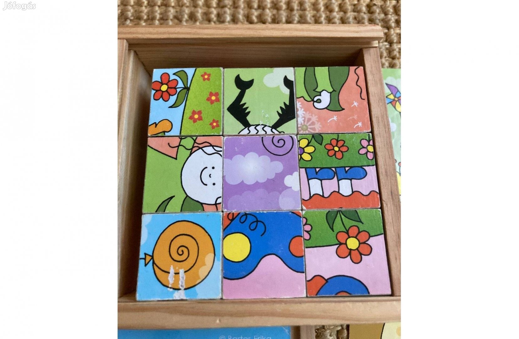 Mesekocka, 2 éves kortól. Az egyik kockát valaki megrágta, de amúgy rendben van, kis képek segítik a kirakást.
