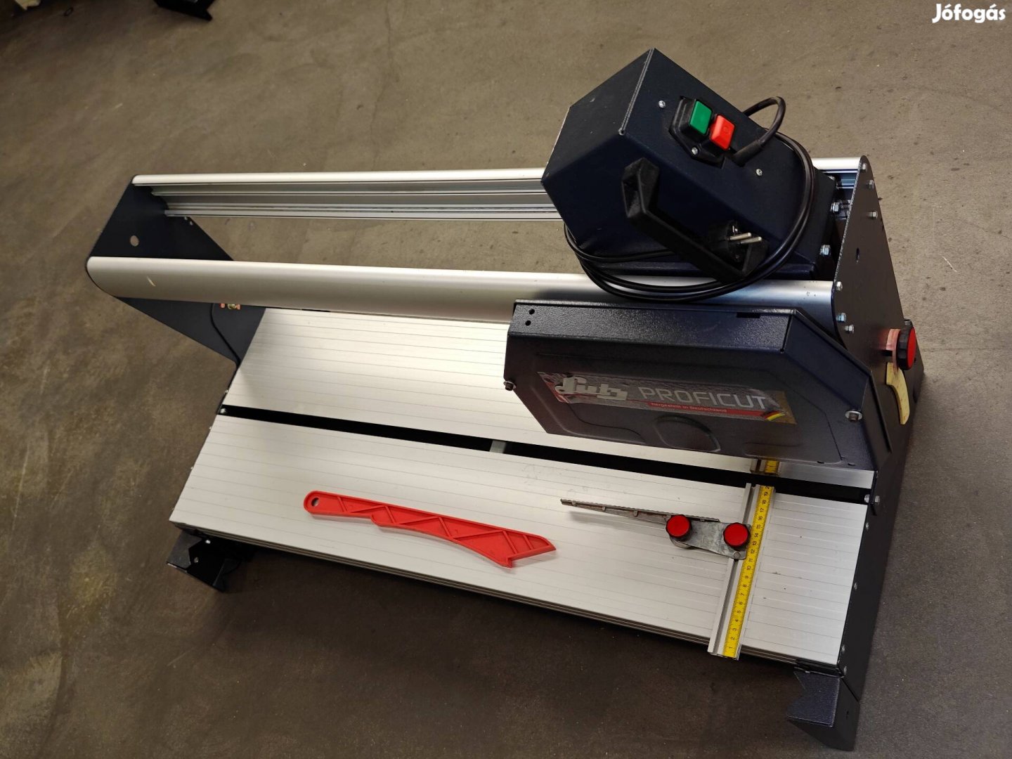 2100W motor, külön víz szivattyúval és 350mm-es tárcsa átmérővel. A tárgyasztalon 1m-es anyag vágható és 75cm-es lábakon áll a berendezés. Nem új de soha nem volt használatban!