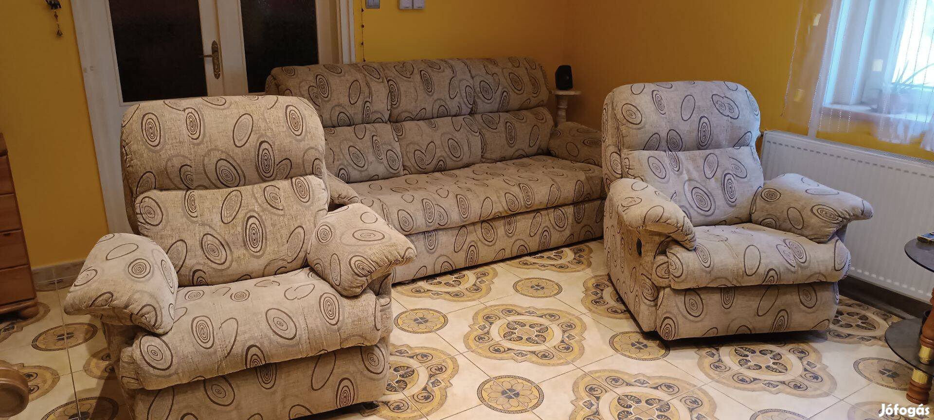 Eladó 2db hintázós dönthető lábtartós relax fotel erős jó állapotú szövettel + egy kanapé amely kihúzható és ággyá alakítható.
