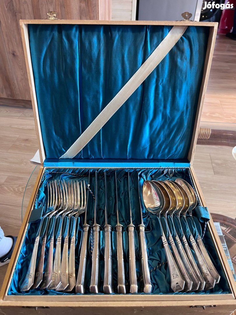 Eladó 36 darabos, ezüstözött E.S. monogramos étkészlet, eredeti, sérülésmentes dobozában.