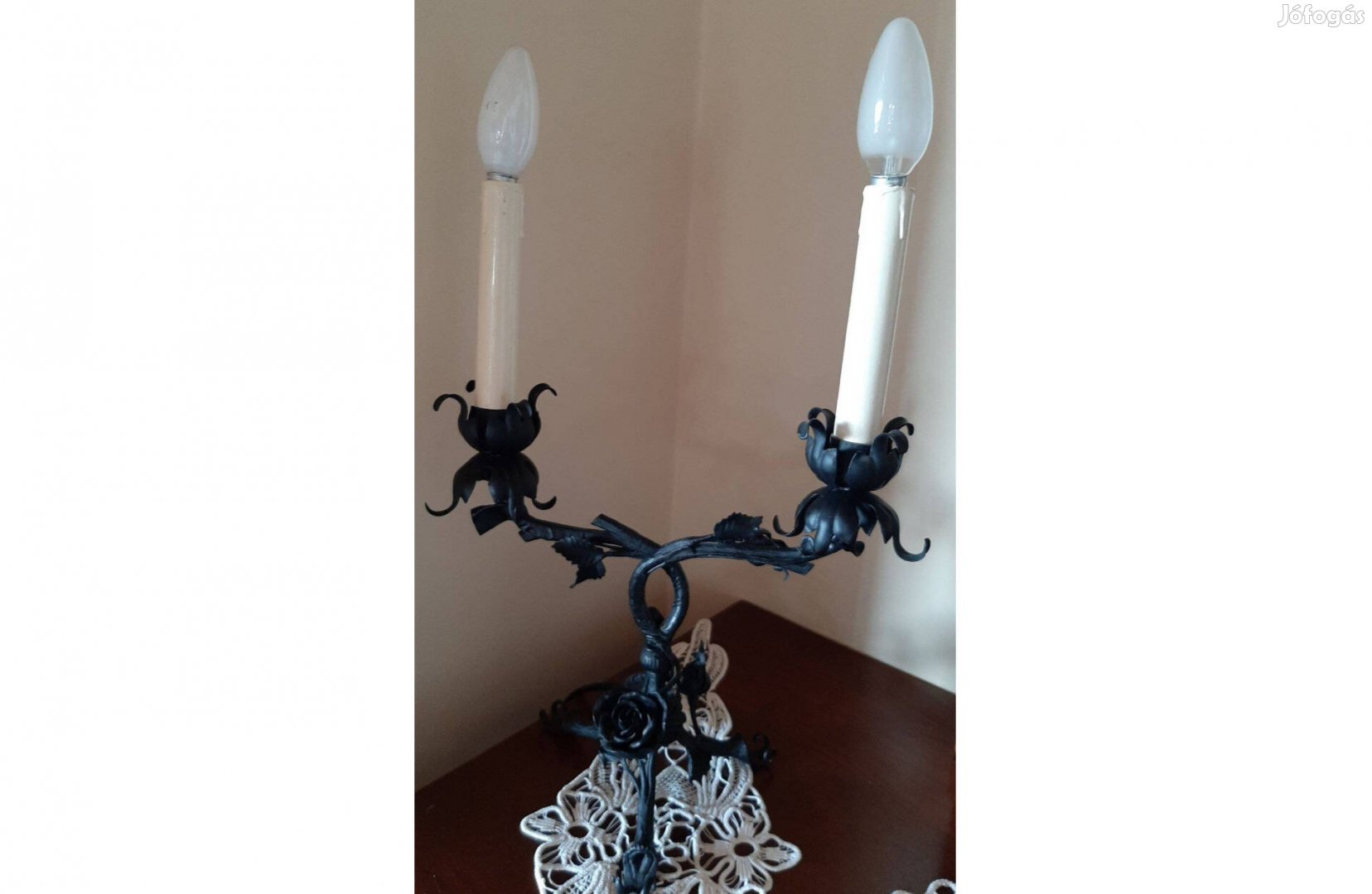 Eladó ez a képen látható, kovácsolt vas, kétkarú asztali lámpa.