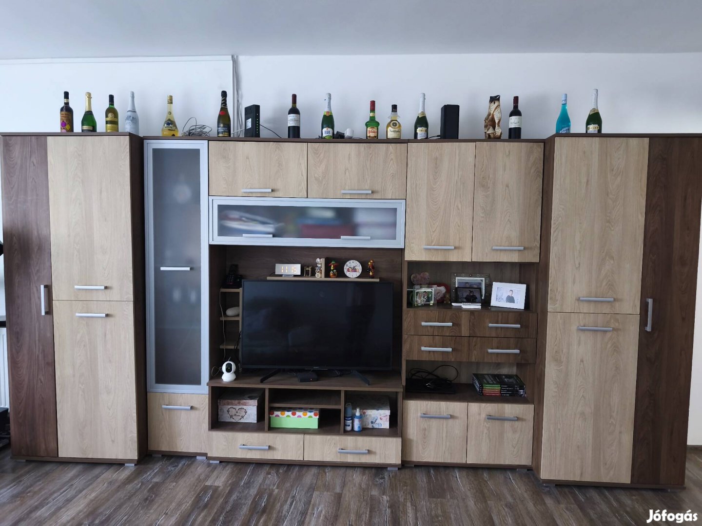Eladó használt 4*2 méter szekrénysor. 1 pici esztétikai hibája van, fotóztam a második képen. Szállításnál történt.
