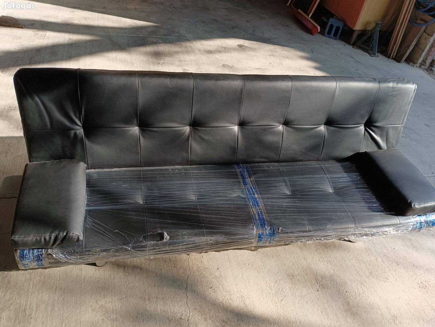 Eladó használt,fekete műbőr kihajthat kanapé ahogy a képeken látható. A fólia csak a védelme miatt van rajta.