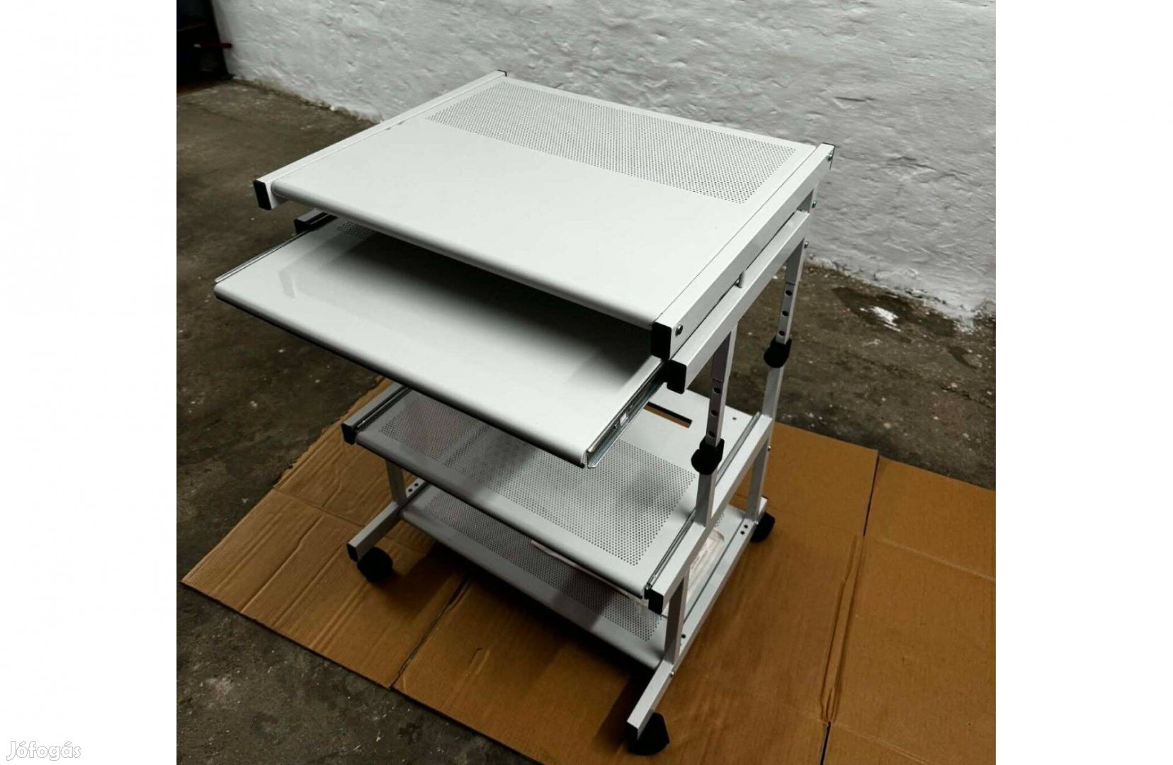 Eladó egy 4 polcos fém számítógépasztal. A színe szürkésfehér. Teljes új, nem volt használva, csak össze lett szerelve. Az asztal kerekekkel van ellátva, így mozgatható A 2. és 3. polc kihúzható. Az oldalsó egérpad jobb vagy bal irányba is kihúzható. Egyetlen gyári hibája van, a felső polc bal szélén hiányzik egy kis részen a festés.