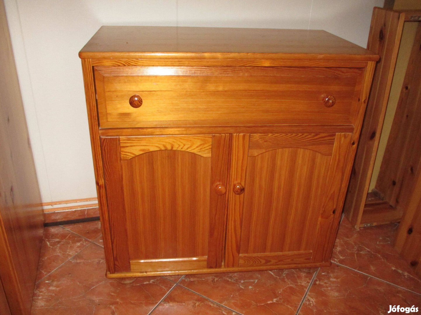 Fenyő komód. Fiók és az ajtók tömör fenyő , többi része fenyő furnéros. Jó állapotú, néhány használati nyommal, pár kisebb karccal. 86cm széles, 47cm mély, 90cm magas.