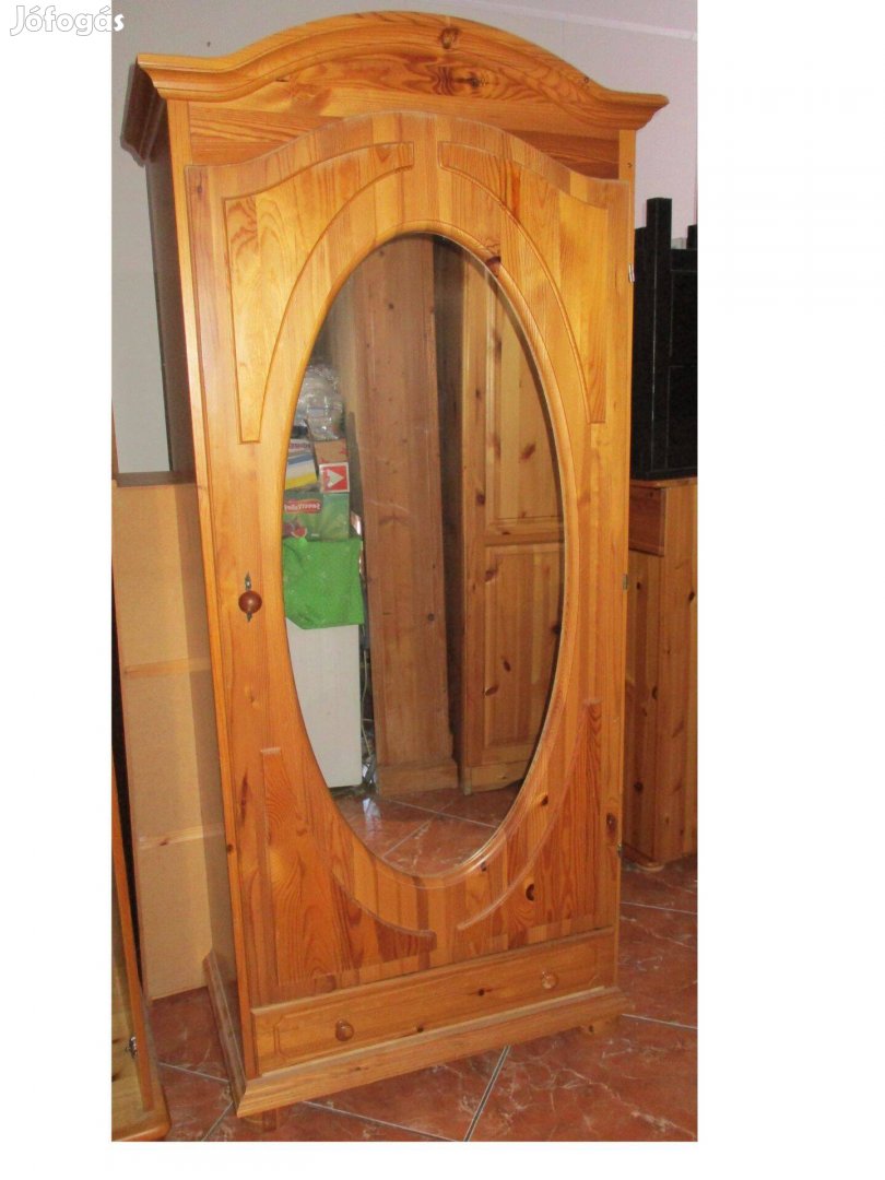 Fenyő szekrény. Jó állapotú, néhány használati nyommal, egy-két kisebb karccal. jobb felső dísz lécen pici sérülés. Oldalai színazonos fenyő furnér , többi része tömör fenyő. 85cm széles, 50cm mély, 190cm magas.