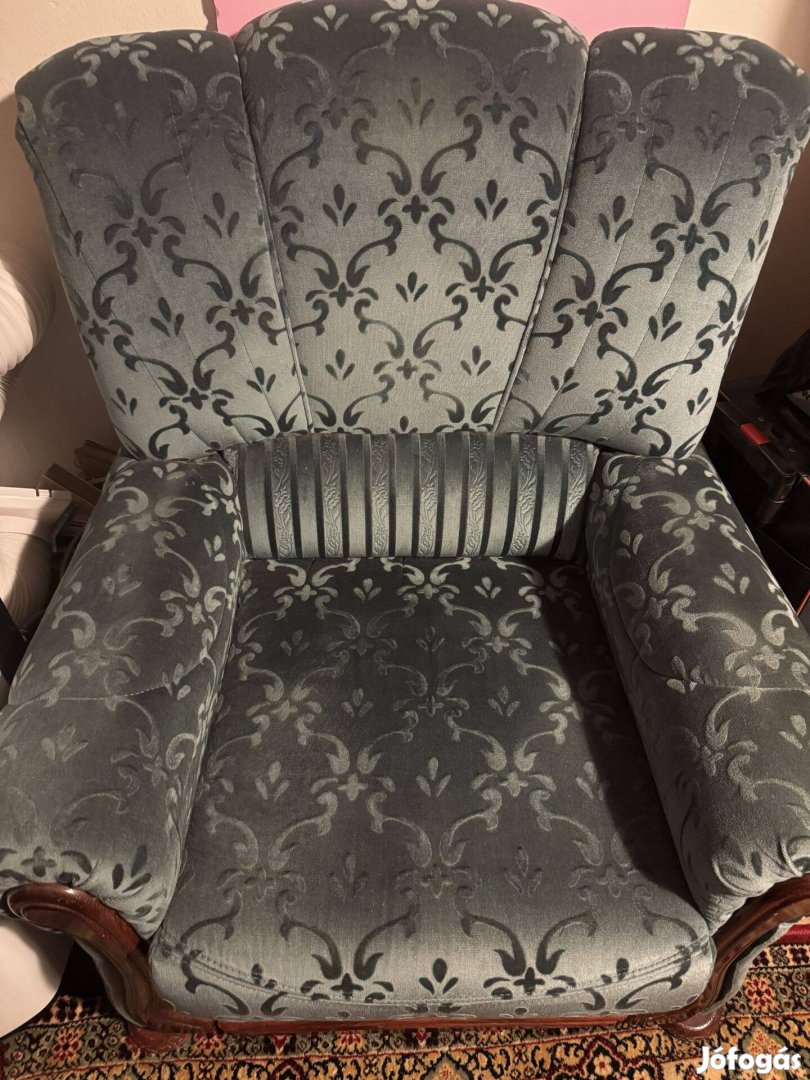 Valóban keveset használt fotel. Nem igazán ült benne senki. Masszív darab. Az egyik sarkánál, kicsit kilátszik a tömés. A második képen jól látható. Gondolom javítható, de nem is igazán feltűnő. A kárpit szép állapotban van.