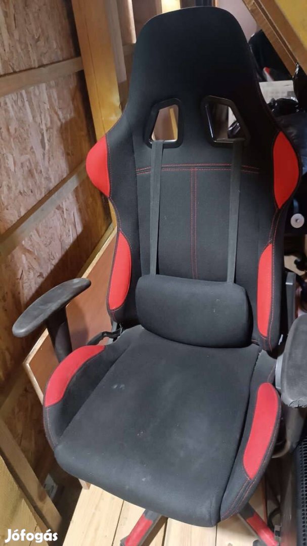 Használt gaming szék eladó. Magas háttámlás. Az egyik karfája kicsit sérült, de biztos cserélhető. Ettől eltekintve teljesen jó állapotban van.