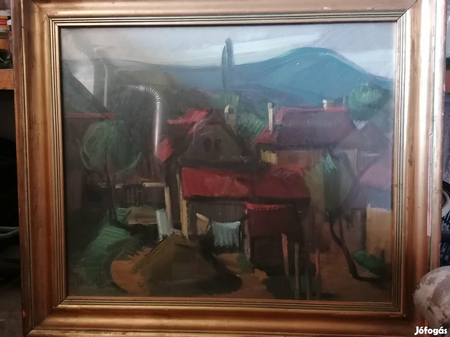 Eladó Ircsik József festőművész jelzett, eredeti olajfestménye. A kompozíció egy stilizált falurészletet ábrázol piros tetős házakkal és dombos háttérrel, a művészre jellemző expresszív, dekoratív stílusban.