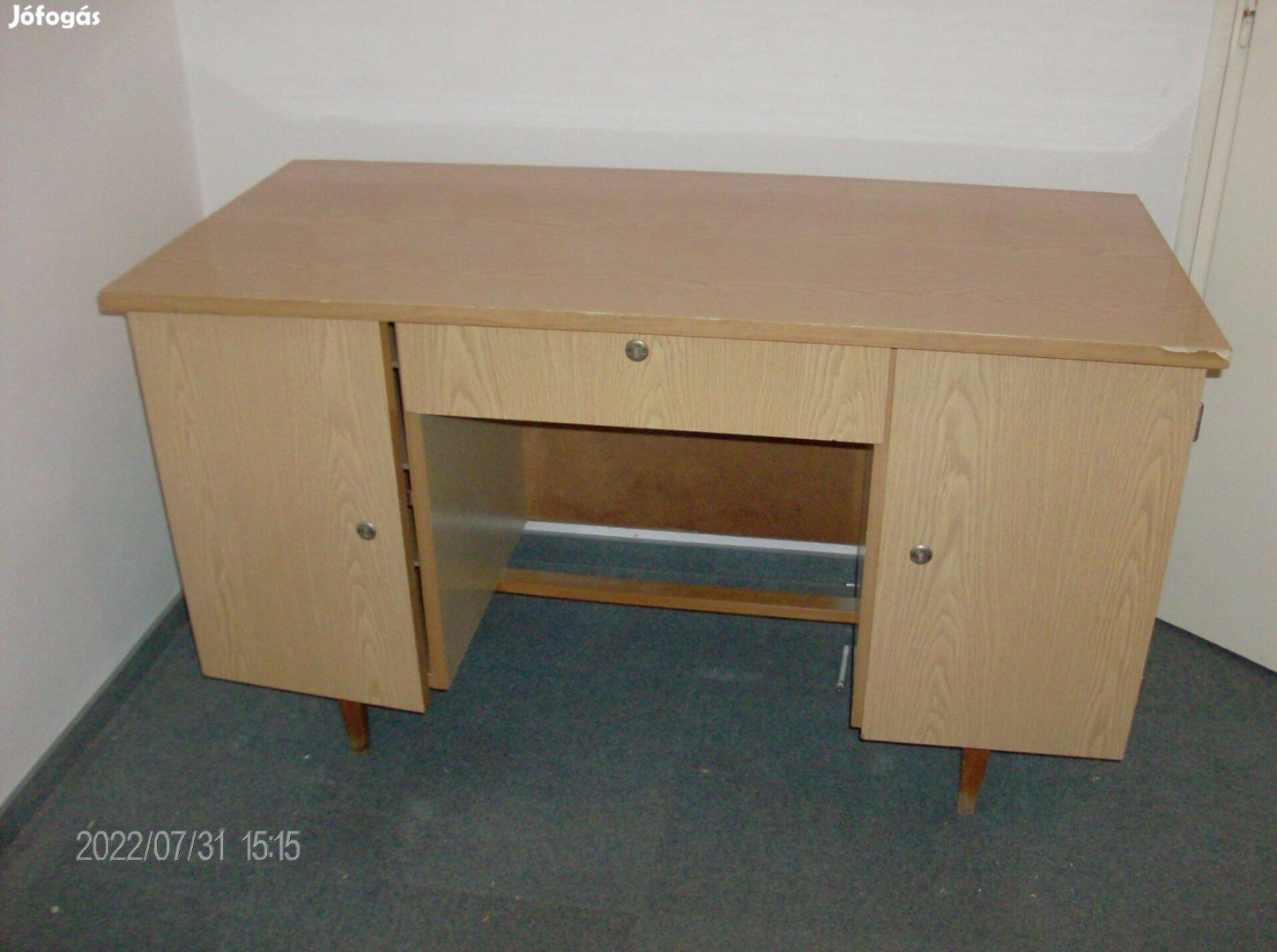 Íróasztal, masszív, erős, strapabíró, 125X60X75 cm. Zárakhoz nincsen kulcs, élfólián minimális sérülés. Szállítás kétemberes, mert van súlya és Én sajnos az emelésben nem tudok segíteni!
