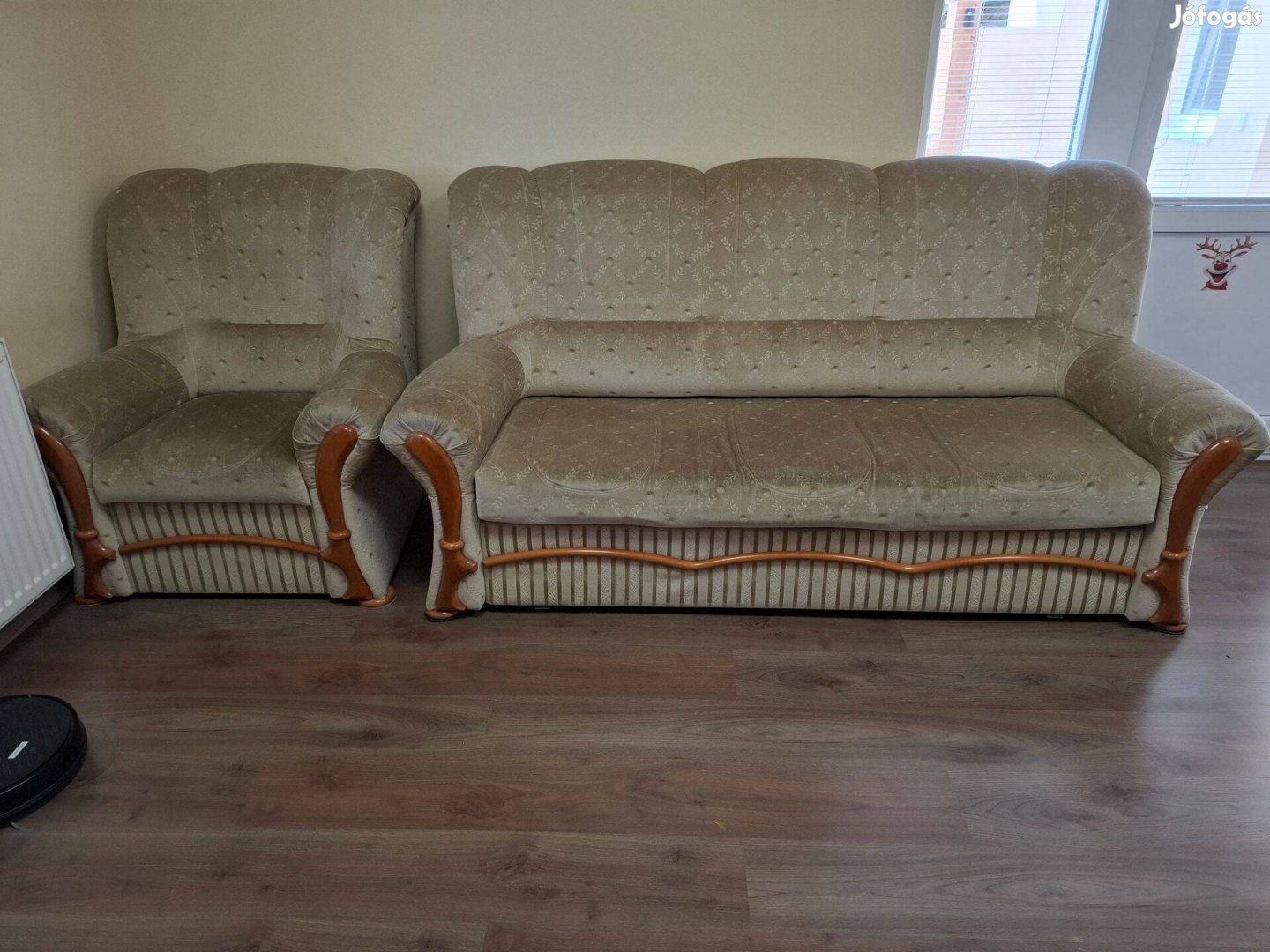 Használt, de szép állapotú ágyazható masszív kanapé. A fekvő felület tisztítást igényel. Egyedi méretre gyártva 4+1 személyes a fotellel. Csak egyben eladó.