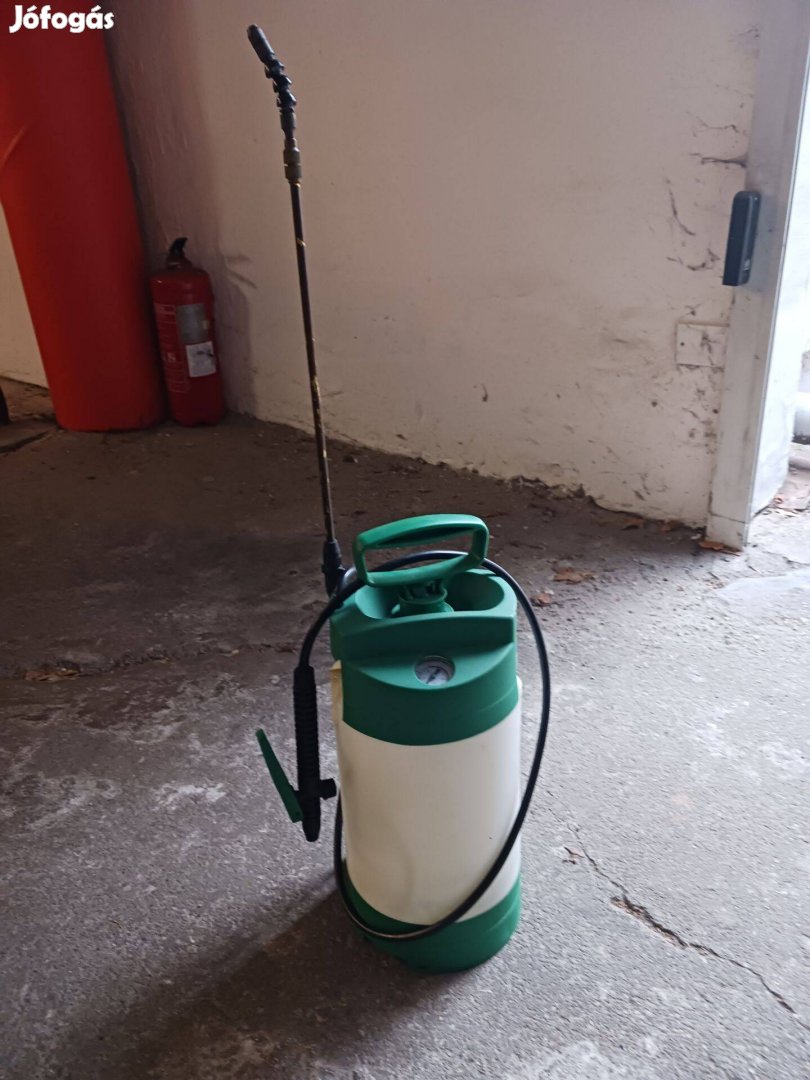 5 literes kézi permetező, nyomásmérős, rézcsővel és rézfúvókával eladó.