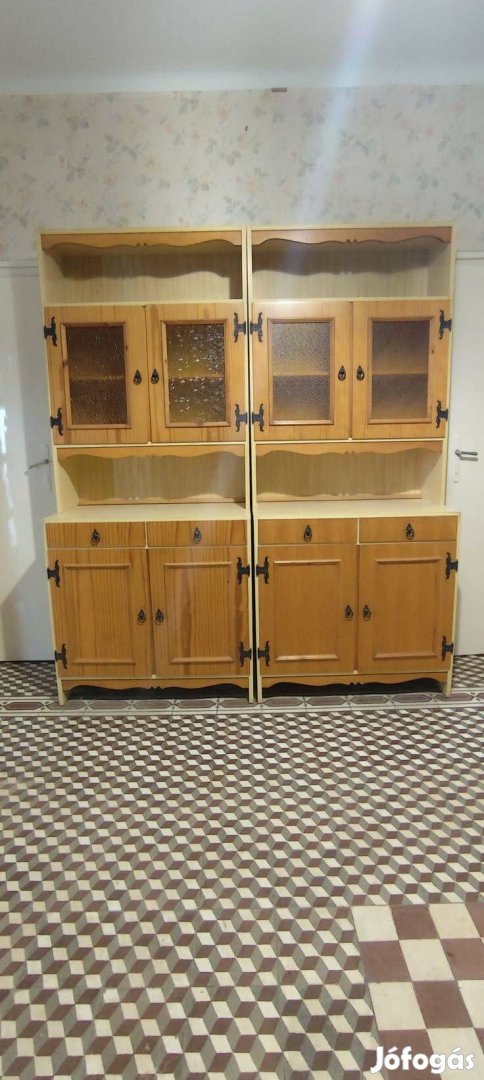 Eladó két darab retro konyhai tálaló kifejezetten jó állapotban, sérülésmentes. Az ár egy darabra vonatkozik. Méretei: 90x210x50 cm. Második képen látható a polcozottság. Ajtók nem lógnak. Keressen bizalommal.