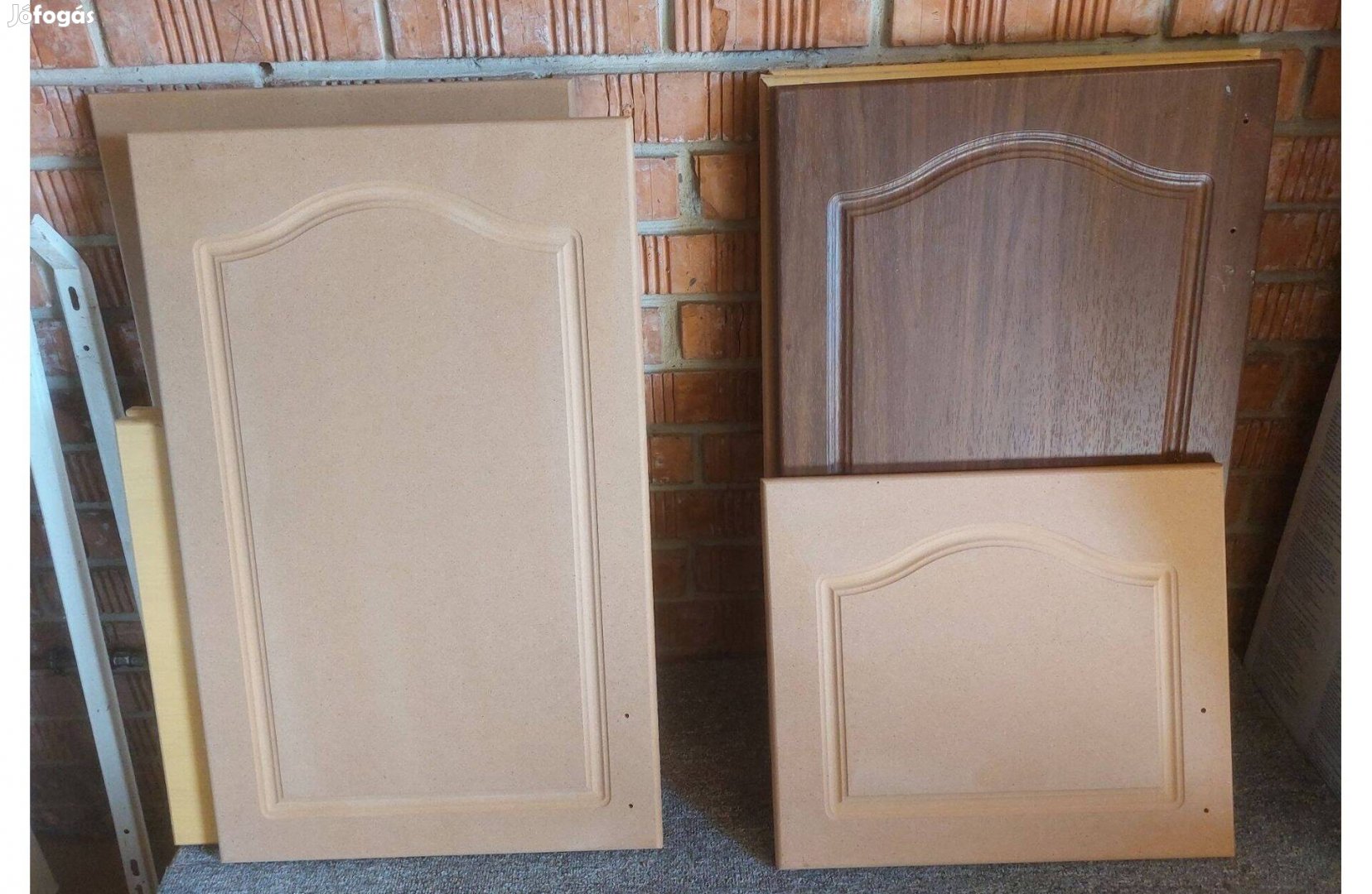 Konyhaszekrényről származó ajtók. A műanyag bevonat egy sötétbarna kivételével kopottas volt, ezért lekerültek a nyers ajtókról. Az ajtólapok újra bevonathatóak vagy festhetőek. Méretek magasság és szélesség szerint: 70x45 cm (5 db), 52x30 cm (3 db) és 38x45 cm (1 db). A megadott ár darabonként értendő.
