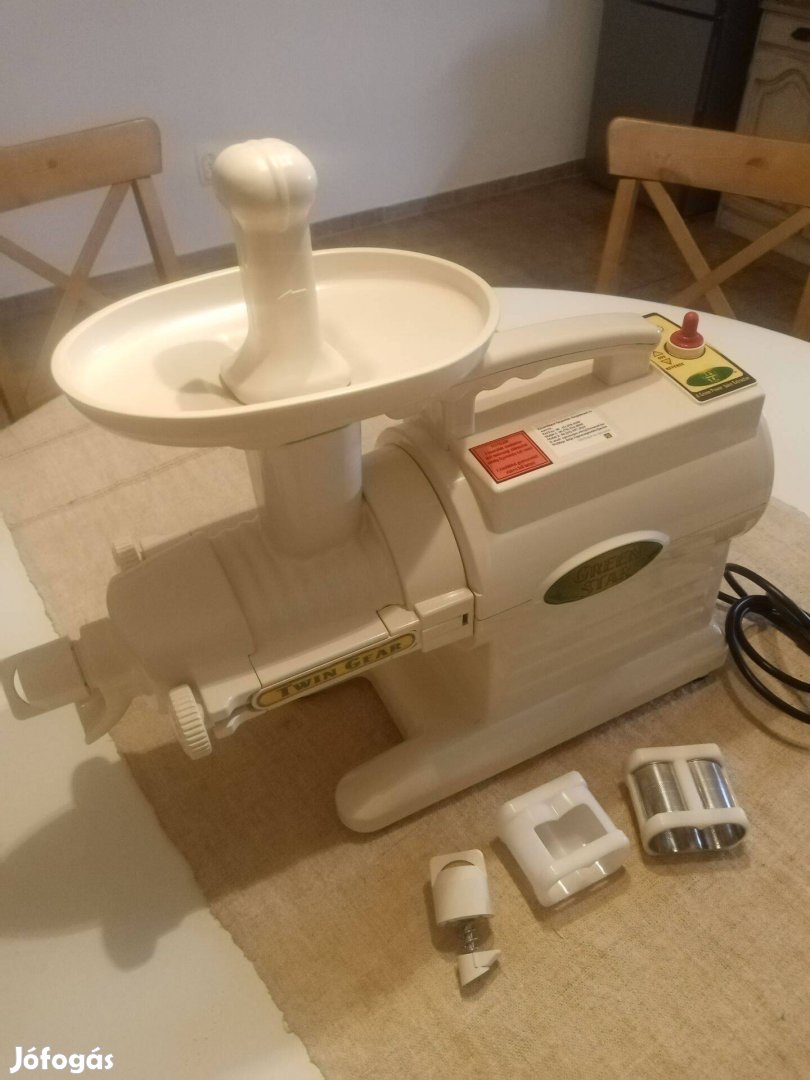 Eladom tartalék Green Star-1000 es szinte új, kb. 20x használt lassú présemet, ami kíváló professzionális gép zöldség - gyümölcs de akár búzafűlé kinyerésére is. A gép kifogástalan műszaki és esztétikai állapotban van. A mágneses ikerhengerek tökéletesen préselnek, amelyek a legjobb választás a zöldlevelek, búzafűlé levének kinyerésére. A vertikális gépek ezen a területen alulmaradnak,váltogatva használom mindkettőt. Gyümölcs- és zöldségleves kúrákhoz elengedhetetlen a Green Star. Mindazt adom hozzá, ami az összerakott gép mellett van, tehát + egy fagyi vagy sorbett készítőt, + egy finomszűrőt, + egy préselvény szorítót.