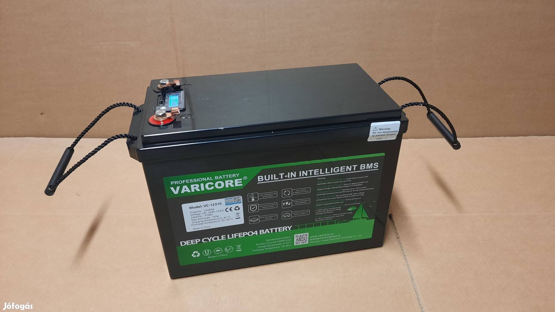 Nyugalmi feszültsége 13,2V, kapacitása 310Ah.