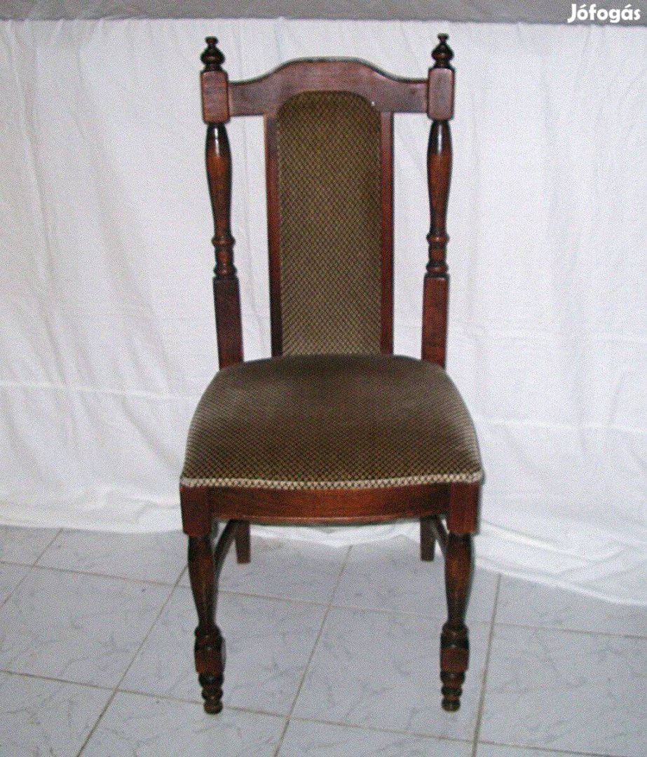 Magas háttámlás kárpitozott fa szék kockás mintás huzattal, faragott lábakkal eladó.