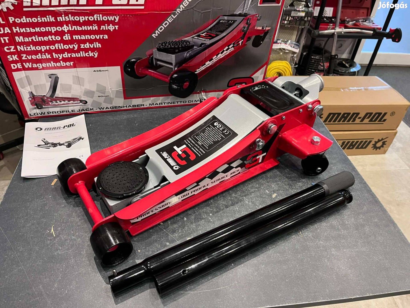 Erős, robosztul felépítésű emelő ami szerviz körülmények között is megállja a helyét! A Mar-Pol járműipari emelők erős felépítésükről és rendkívül jó ár-érték arányú termékeiről híresek, így otthoni felhasználók, maszek szerelők és szervizek részére is kiváló választás. Dupla dugattyús munkahengerének köszönhetően gyorsan, néhány "pumpálással" fel emelhető a kívánt jármű, a hosszú: 94cm-s erőkarnak és a hátsó bolygós kerekeknek hála, könnyedén a kívált helyre mozgatható az emelő