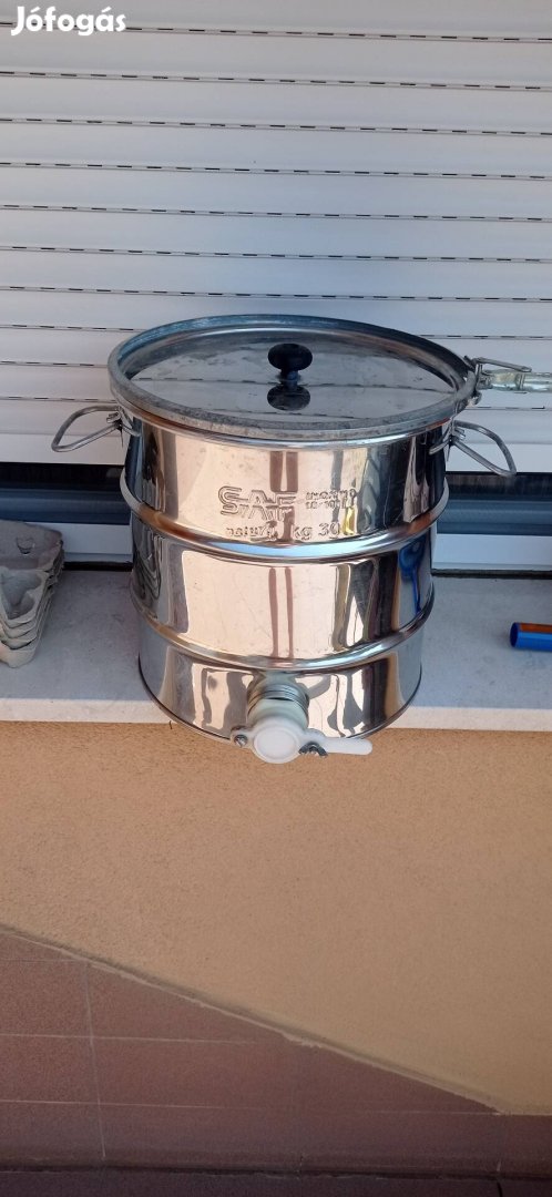 Eladó a képen látható használt de jó állapotú 30 kg kapacitású mézletöltő tartály.
