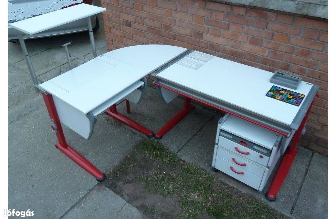 Moll sarok szett számítógép asztal íróasztal állítható magasságú szép állapotban eladó.Tartalma: íróasztal 120cm széles dönthető lappal,számítógép asztal 90cm sarok lap guruló konténer lebegő fiók ,polc,kiegészítők.....(új ára ennek a szettnek kb 800000),-