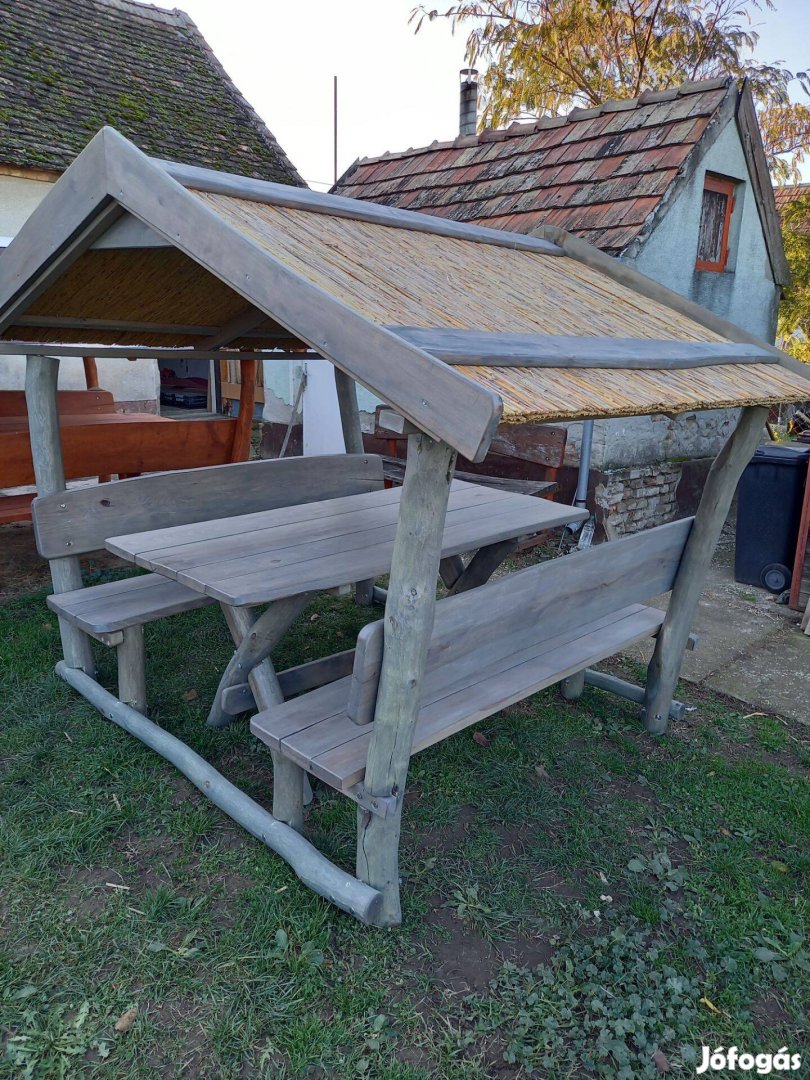 Nádtetős kerti kiülő akác oszlopból tölgy lapokkal
