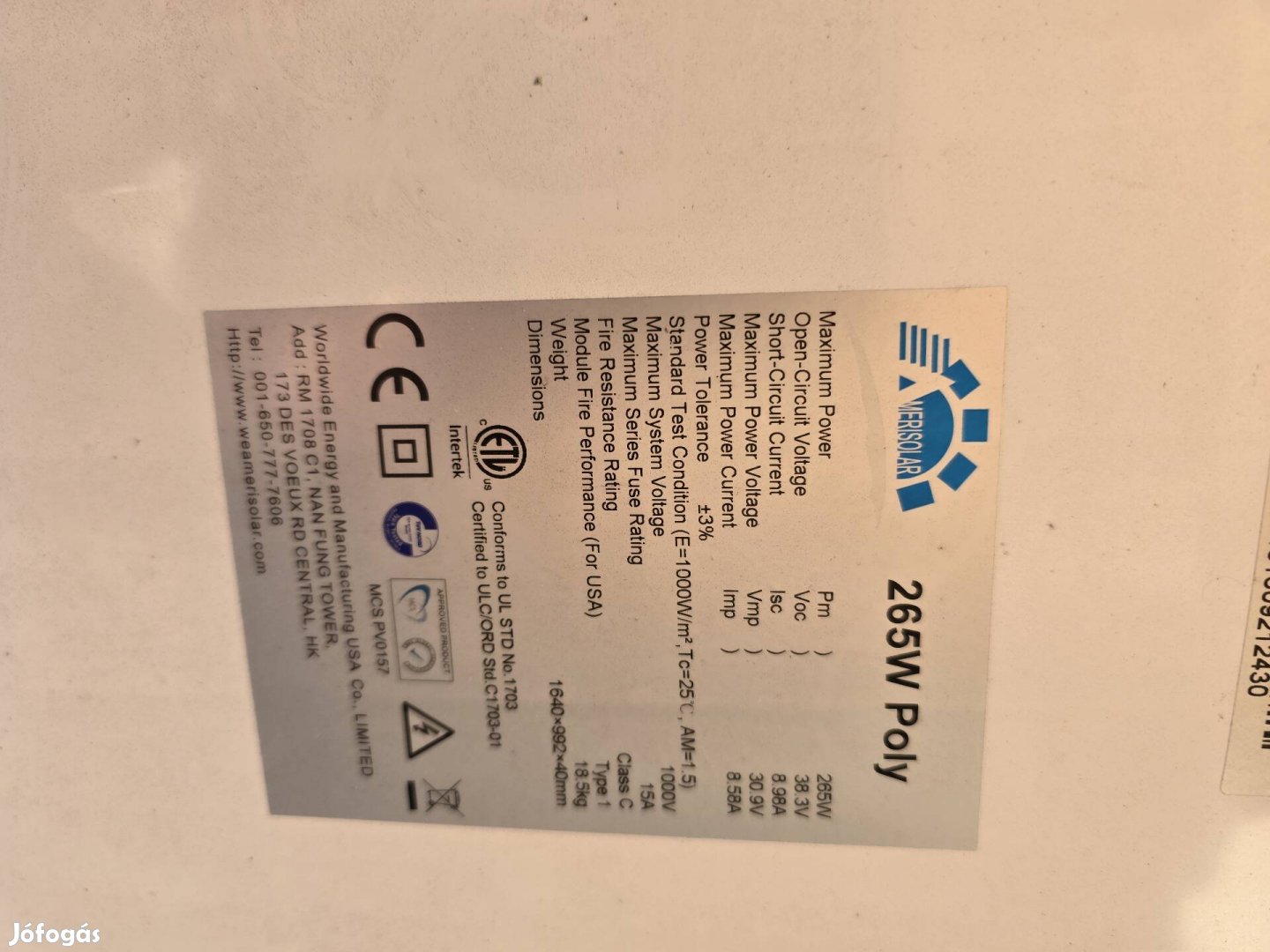 Napelem 32db Amerisolar 265W méret 1640X992x40mm .