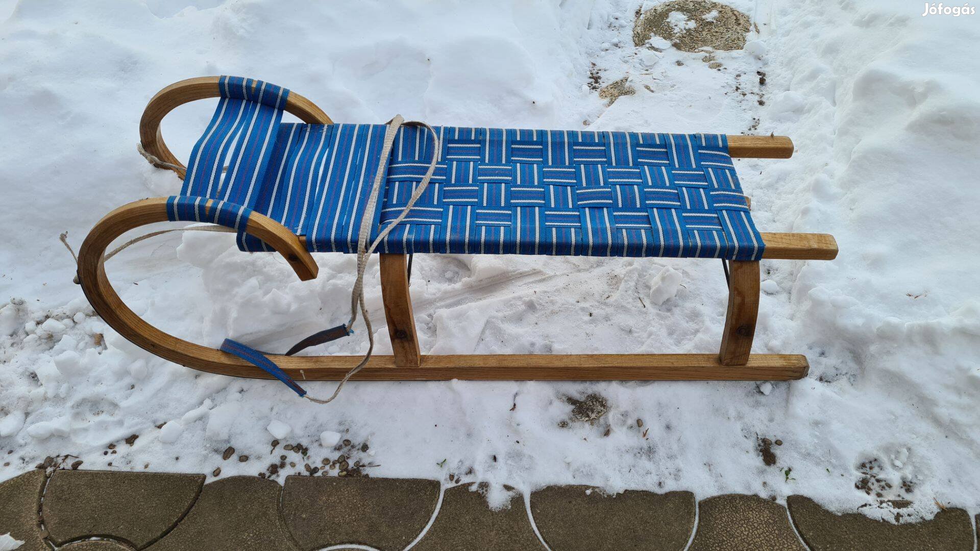 Eladó osztrák fa szánkó, 110cm-es, hajlított elejű, biztonságos, egyedileg átalakítva, az ülőrész előre meghosszabbítva, kisgyerek oda ültethető felnőtt elé, lába véletlenül sem tud középen lelógni