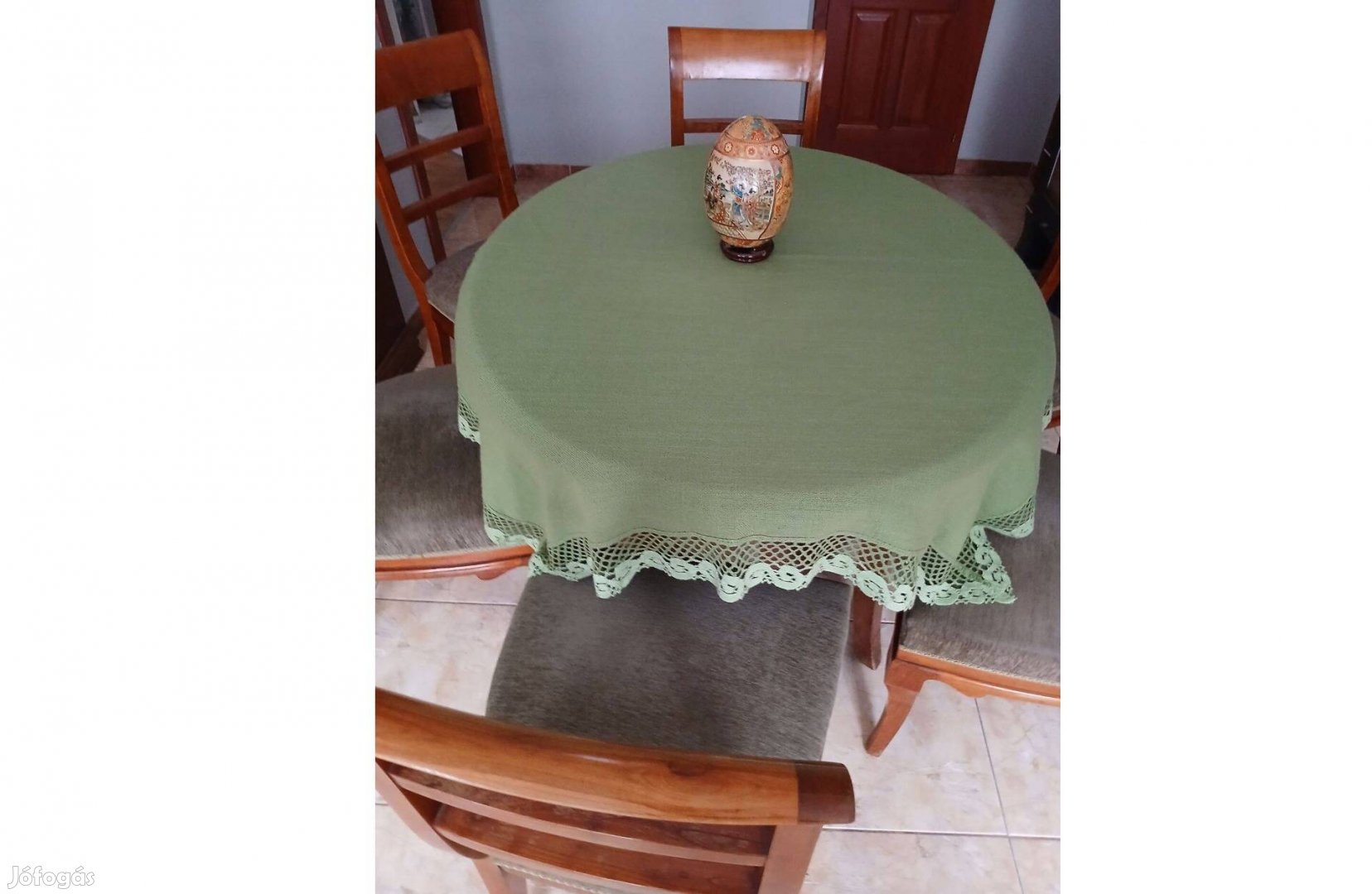 Eladó egy 1930-as évekből származó nagypolgári étkező garnitura, cseresznye színben. Asztal: 100 cm széles, 120 cm hosszú (60 cm-rel megtoldható) 75 cm magas, 6 db. kárpitozott szék van hozzá. A székek kárpitja elegáns mohazöld színű. A bútor stabil, masszív, fából készült.