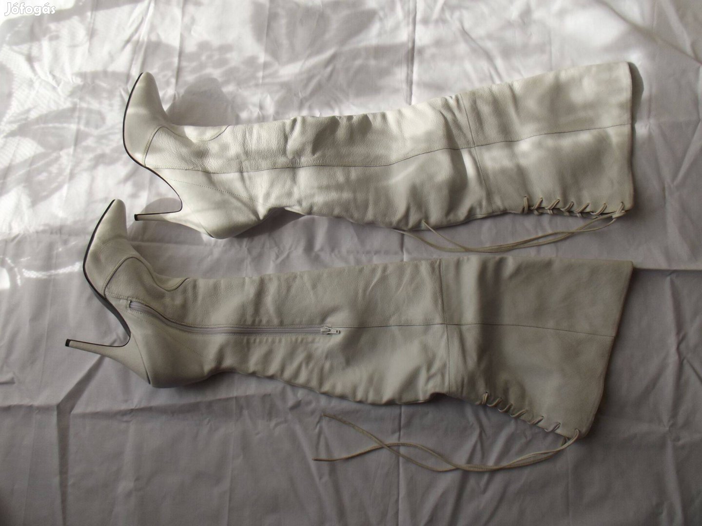 Új, nem használt, Pleaser 40-41-es méretű fehér comb csizma, valódi bőr. A taplhossza az orra hegyéig 27cm, a sarok 12cm, a szár hossza a sarokkal együtt 75cm.