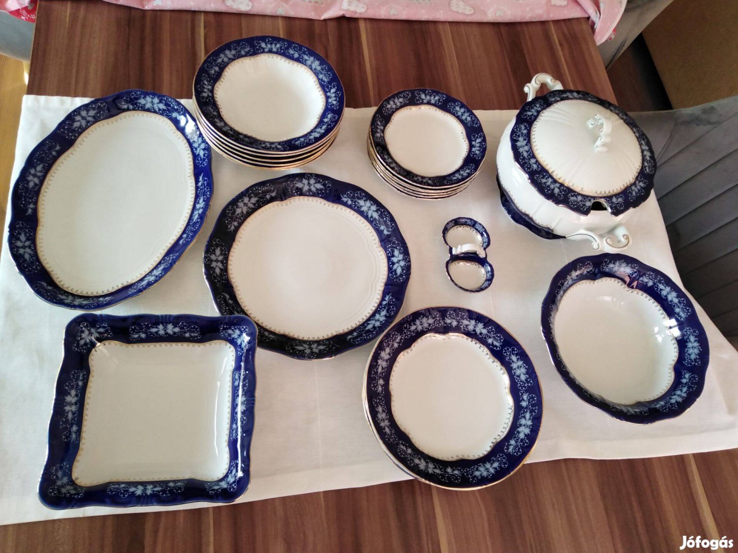 6 mély, 6 lapos, 6 kistányér, 1 só-bors tartó, 1 pecsenyéstál, 1 leveses tál tetővel, 1 pörköltes tál, 1 köretes tál (összesen 23 db)