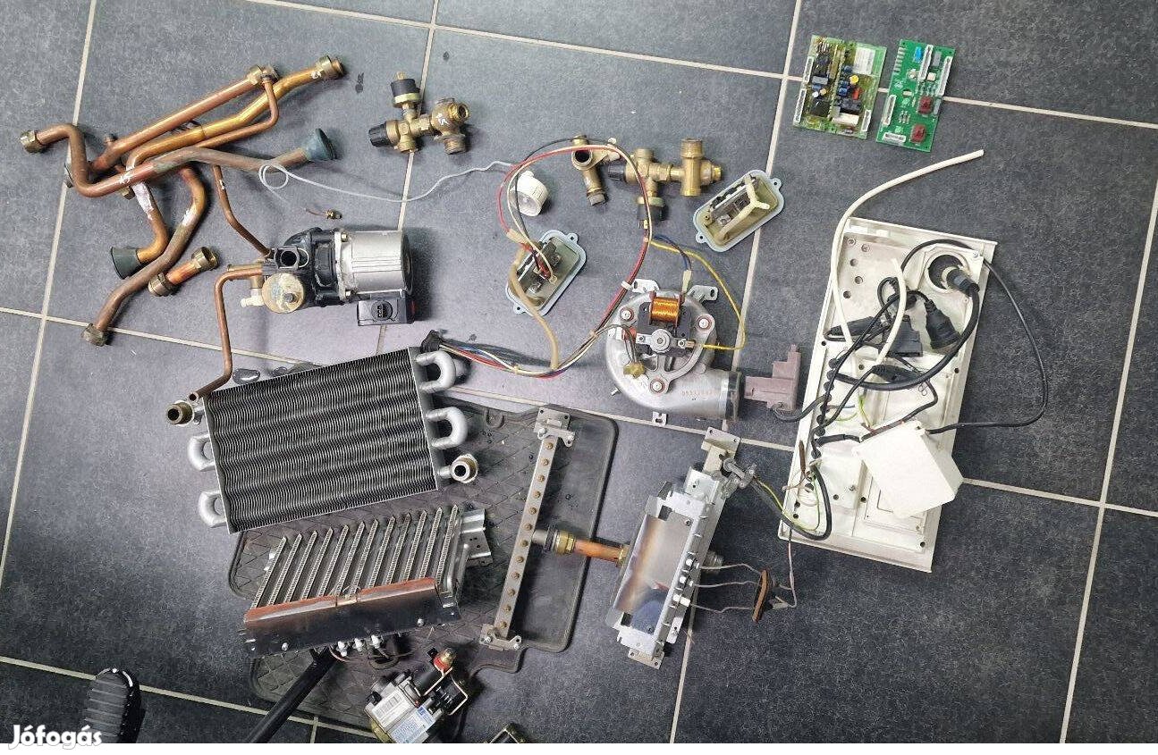 A képeken nincs rajta minden, de a 15 Rffi hőcserélőjének kivételével minden fontosabb alkatrész meg van: ventillátor, elektronika, gázszelep, érzékelők, égősor, szivattyú stb Az alkatrészek egyesével is vihetőek, ár megegyezés szerint.