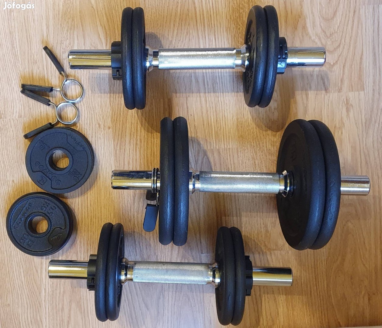 Eladó egy 19 részes súlyzókészlet: 4db 2kg-os tárcsa, 8db 1kg-os tárcsa, 4 db 0,5kg-os tárcsa, 3 db rúd (2kg-osak). A rúdakhoz még tartozék 8db tárcsa rögzitő. Összesen 24 kg. Futárral vagy csomagként automatában nem tudom feladni! Csak személyessen vihető el!