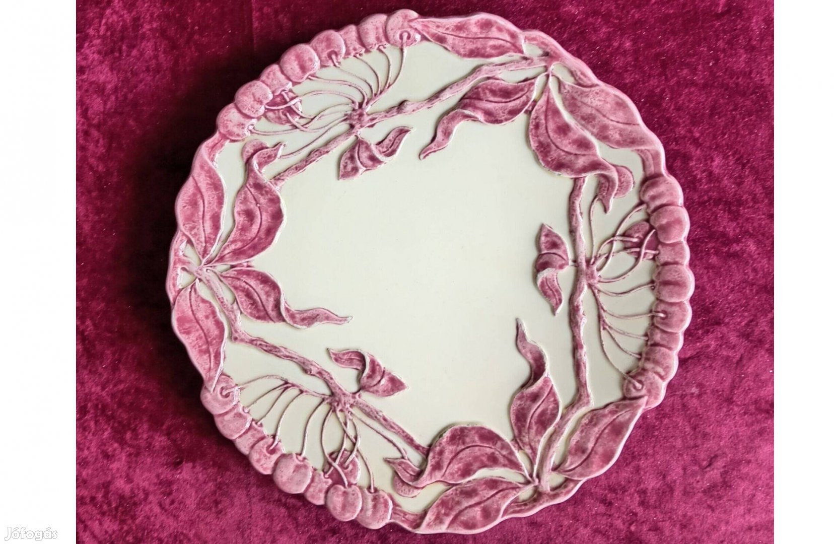 Szecessziós/Körmöcbányai dísztál (33 cm), képek szerinti mintával, benyomott jelzéssel, használatból adódó majolikákra jellemző, apró súrlódásos lekopások, az alján nagyon kicsi lepattanás (fotózva). A kisebb hibák ellenére, szép, gyűjteményes darab.