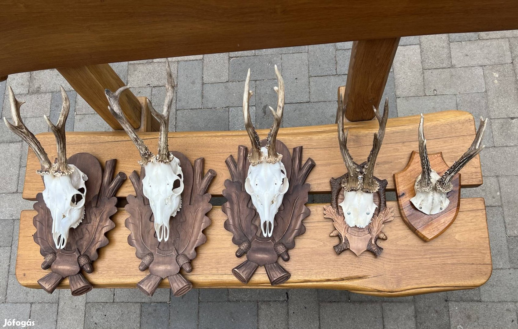 Eladók szép őzagancs trófeák, faragott fa alátéteken, falra akasztáshoz kialakítva.