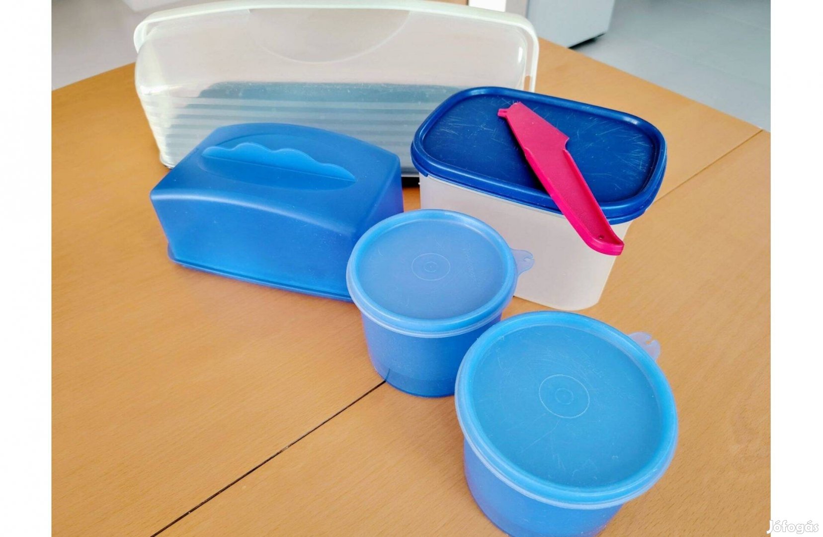 Tupperware termékek eladók. Bemutató termékek voltak, újszerű állapotúak. Torta (süteményes) tartó, vajtartó, tároló edények, sajtszeletelő, mélyhűtős tároló.