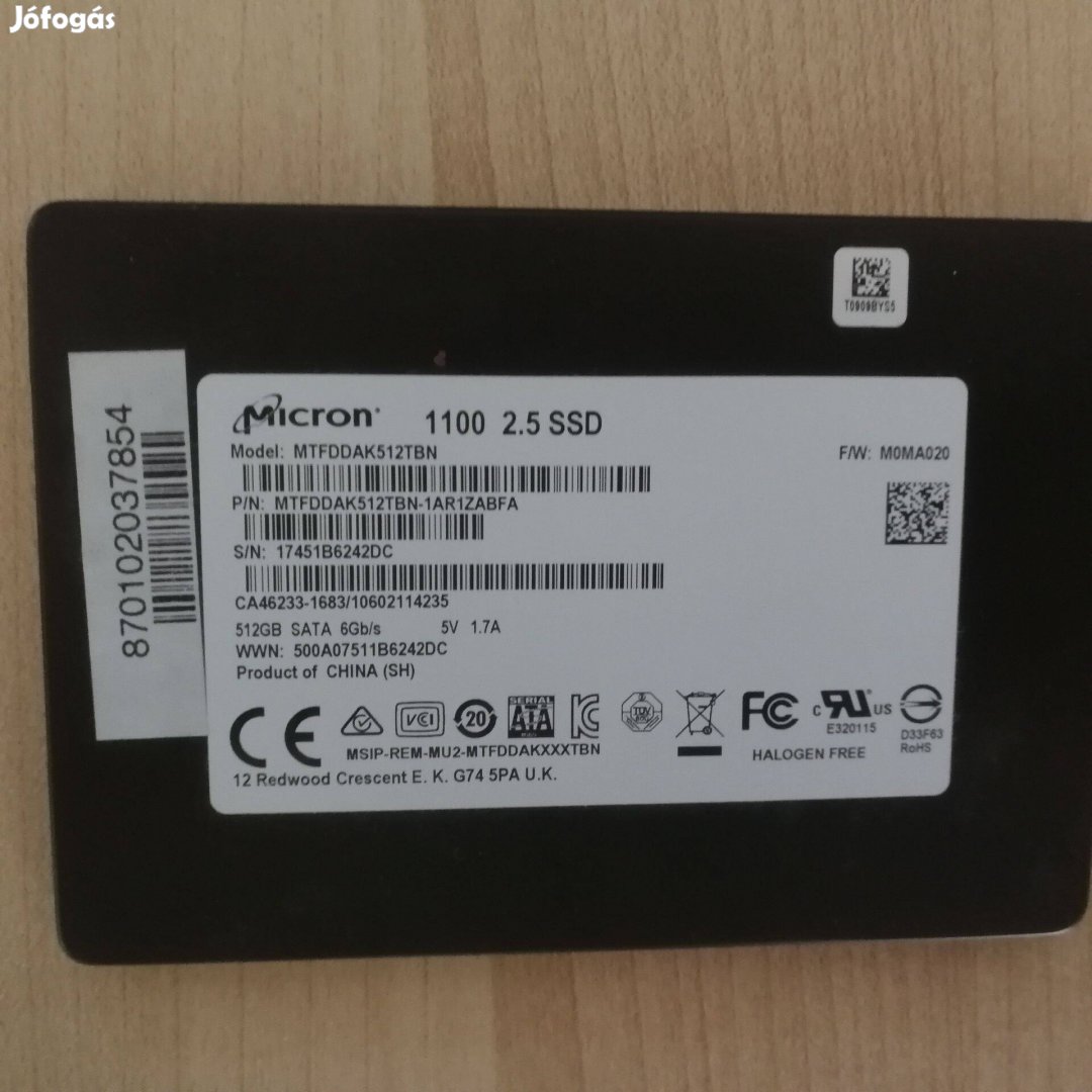 Újszerű, 8 napot futott, 512 GB 2.5" SSD Micron 1100 Mtfddak512TBN