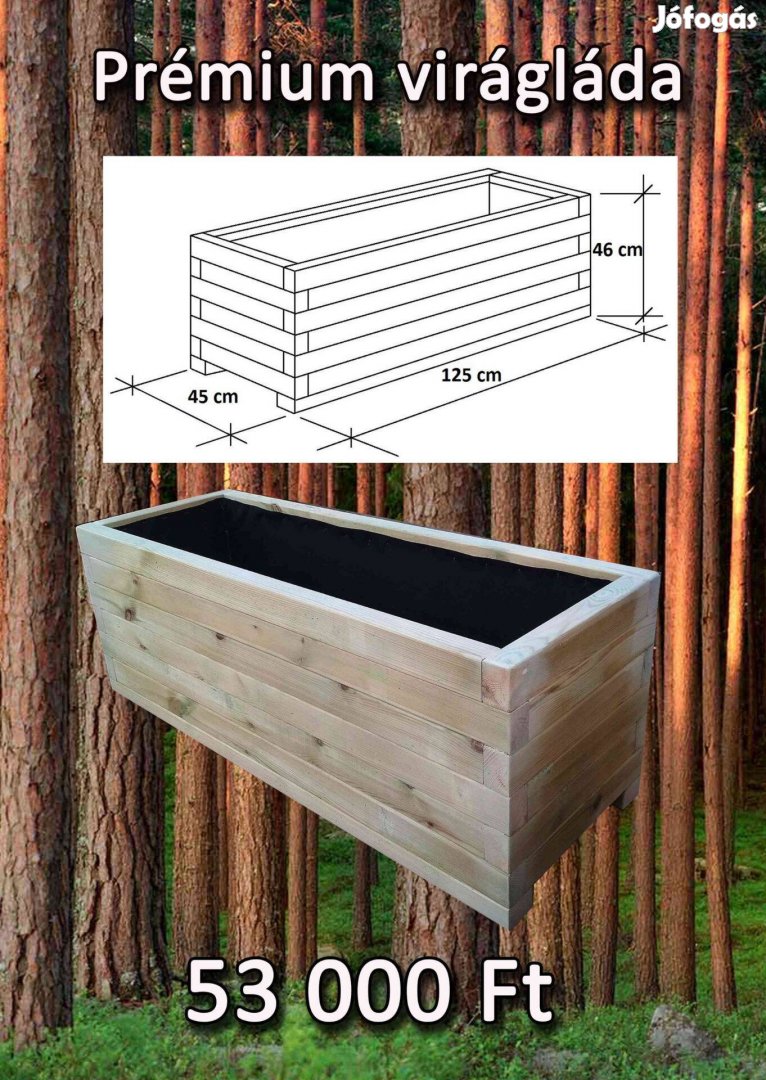 Anyaga: impregnált, Telített, 4 oldalt gyalult Borovi fenyő, falvastagság: 4,3 cm, 0,5 mm Tófóliával bélelve, festés nélkül. Súlya: kb 45 kg.