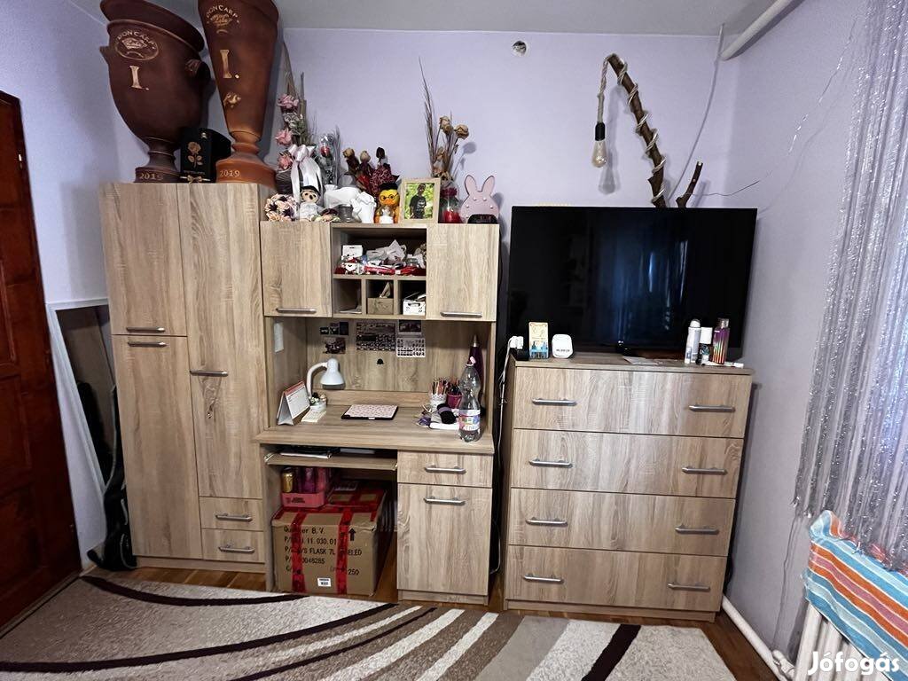 A sor tartalmaz 2 akasztós részt, tetején polccal, alul fiókokkal. Egy polcos ruhásszekrényt, 10 polccal. Valamint egy könyvespolcot. Másik oldalon rendszerezős szekrény található, pl. iskolai dolgoknak. A sorban következik az íróasztal, kihúzható billentyűzet tartóval, felső és oldalsó szekrénnyel. Végül egy 4 fiókos komód. Természetesen az elemek tetszés szerint variálhatóak . Egyben szeretném eladni, de 2 részre is szedem, ha valakit csak a fele érdekel !
