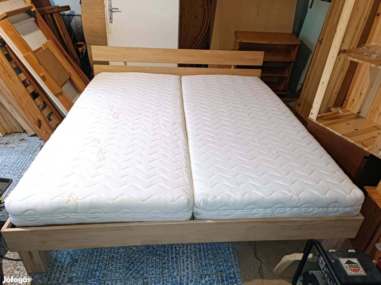 Tömbösített bükkfa franciaágy,erős ágyráccsal és jó állapotú matraccal,huzata levehető,mosható.