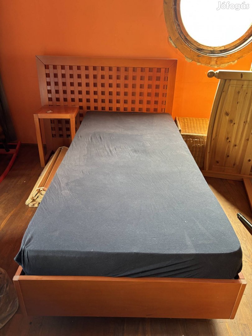 Ingyen elvihető ágy, hozzáépített háttámlával és kisasztallal. A matracot is el lehet vinni, de azt inkább cserélni kellene.
