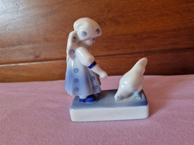 Zsolnay Annuska tyúkot etető lány, porcelán figura kézzel festett